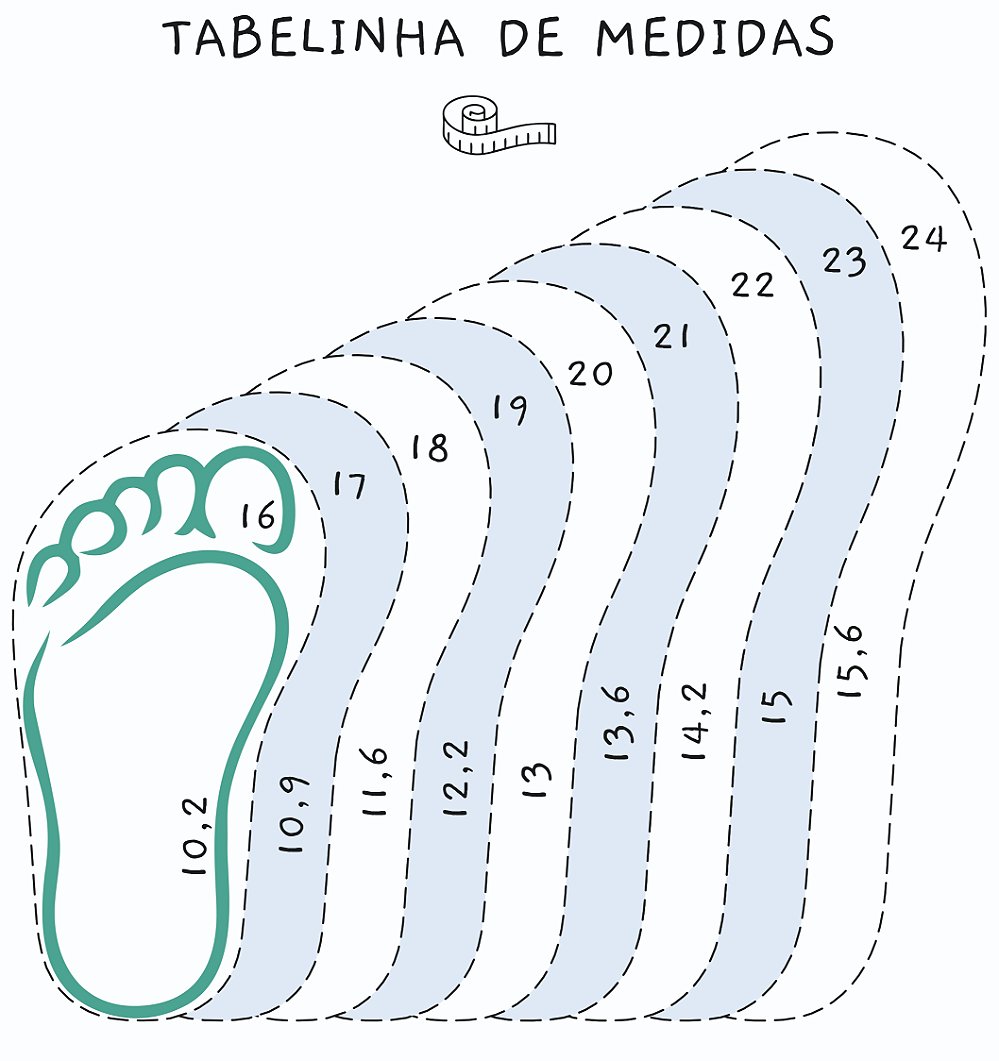 Caso queira posicionar sobre a imagem, depois de medir com a folha de sulfite, basta clicar neste link: https://acrobat.adobe.com/id/urn:aaid:sc:VA6C2:555ba4f5-5ced-4b29-b223-9554ee8a203b e imprimir, depois pode colocar o pézinho do bebê em cima do número correspondente ao que você quer comprar. Assim você conseguira´visualizar melhor se este é o tamanho ideal. Mas não se preocupe, conseguirá escolher o tamanho mesmo sem ter ela impressa.